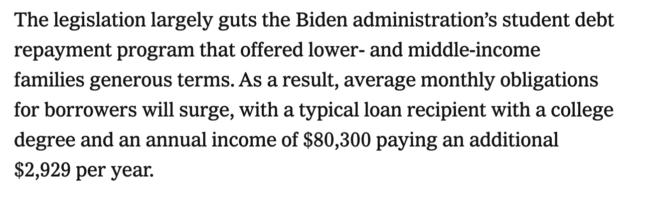 From the New York Times, the budget bill just passed by congress guts much of the loan relief that the previous administration had put in place as most borrowers will now face much higher payments.